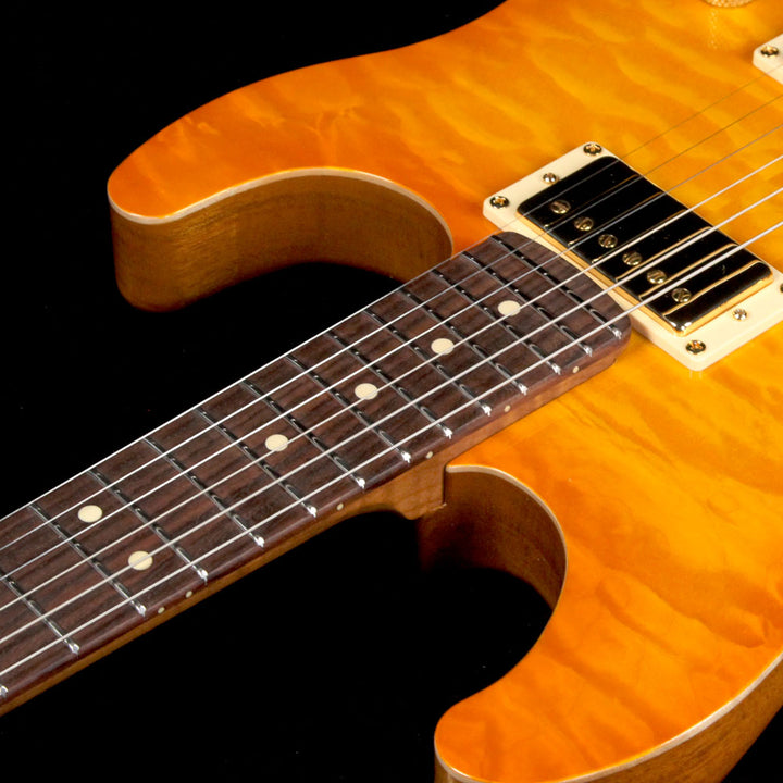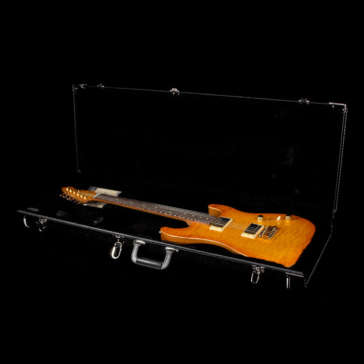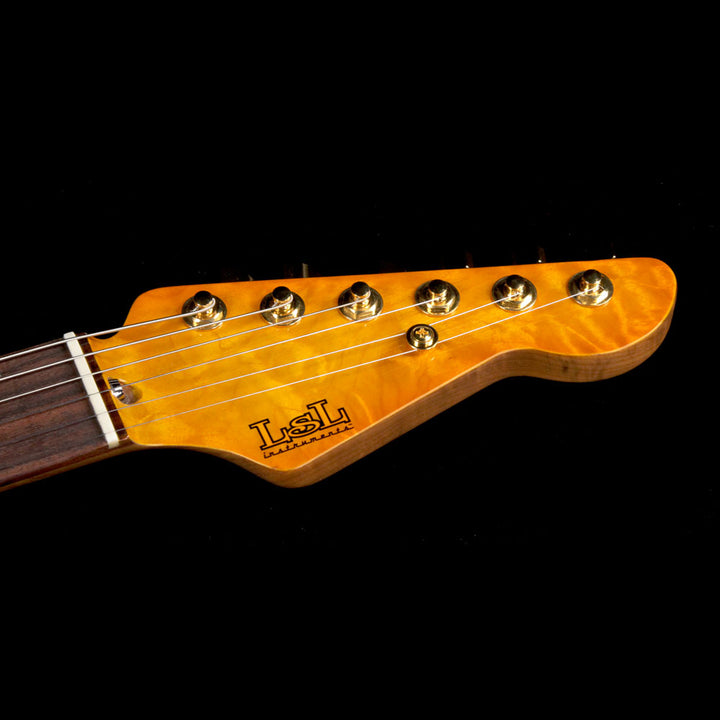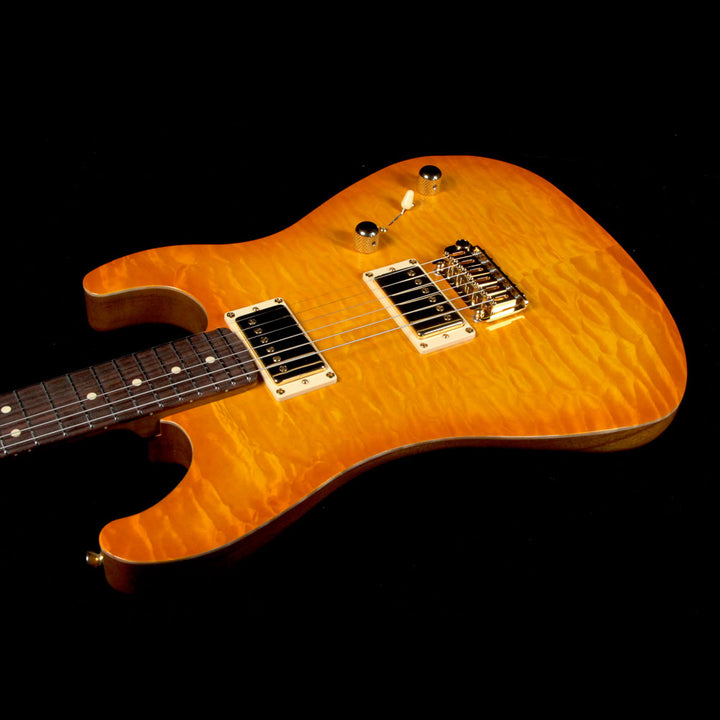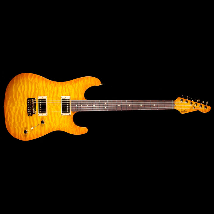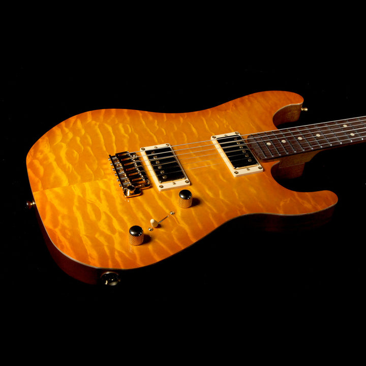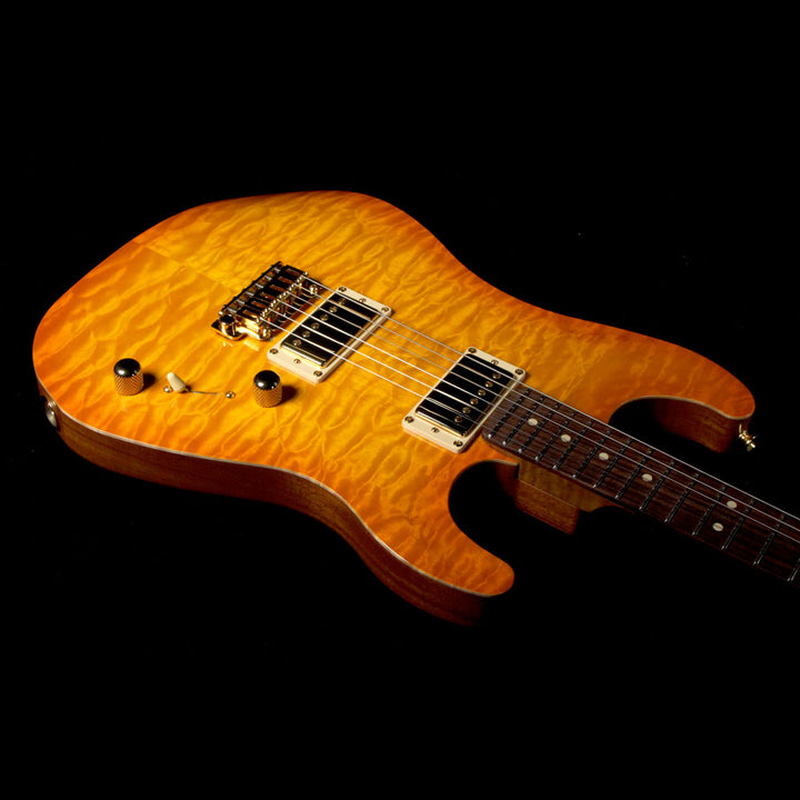 This stunning LSL Instruments XT2-DX is inspired by the Generation X era of Sunset Strip! This shredder is ready for anything, and is built with the utmost care and attention to detail. This beauty features a mahogany body with a transparent amber finished quilt maple top, a smooth and comfortable roasted maple Medium C neck, a 12" radius rosewood fingerboard carrying 22 stainless steel frets, LSL high output humbuckers, a Gotoh 510 trem, and all gold hardware!
