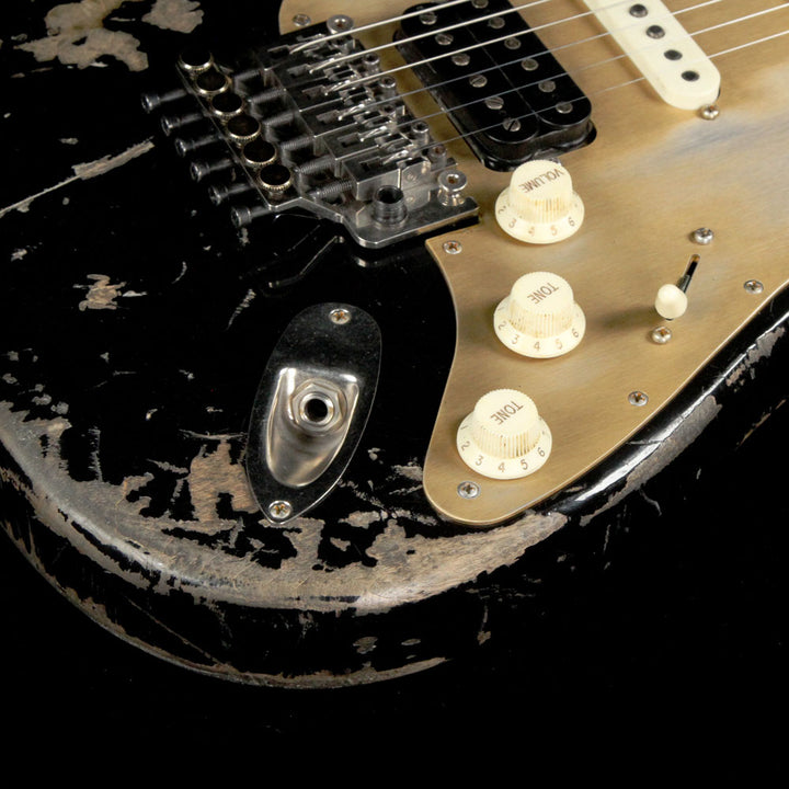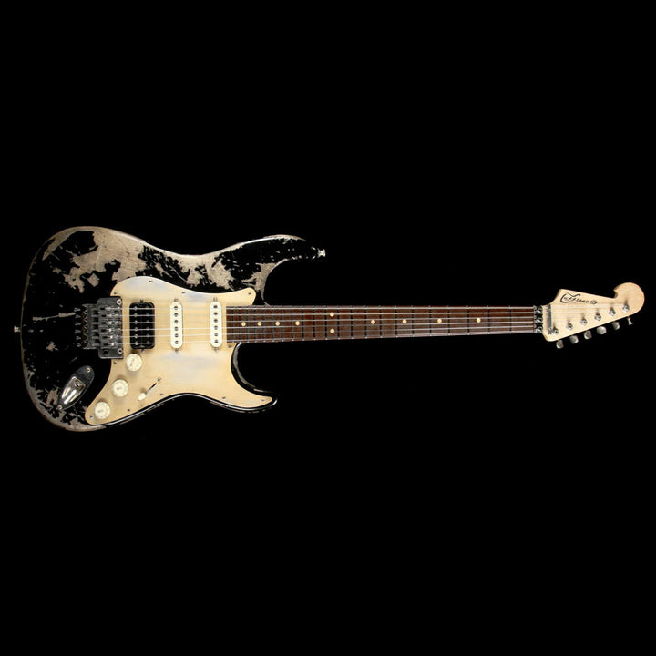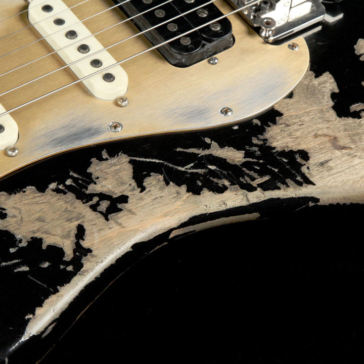 This ripper is a Luxxtone Choppa S guitar with a super gnarly looking Destroyed Black finish over an alder body, with a snappy maple neck and great looking Brazilian walnut fretboard. The guitar is meant to be a heavy riffer with a HSS pickup configuration and Floyd Rose tremolo for divebomb effects, and the anodized pickguard looks great against the relic finish.