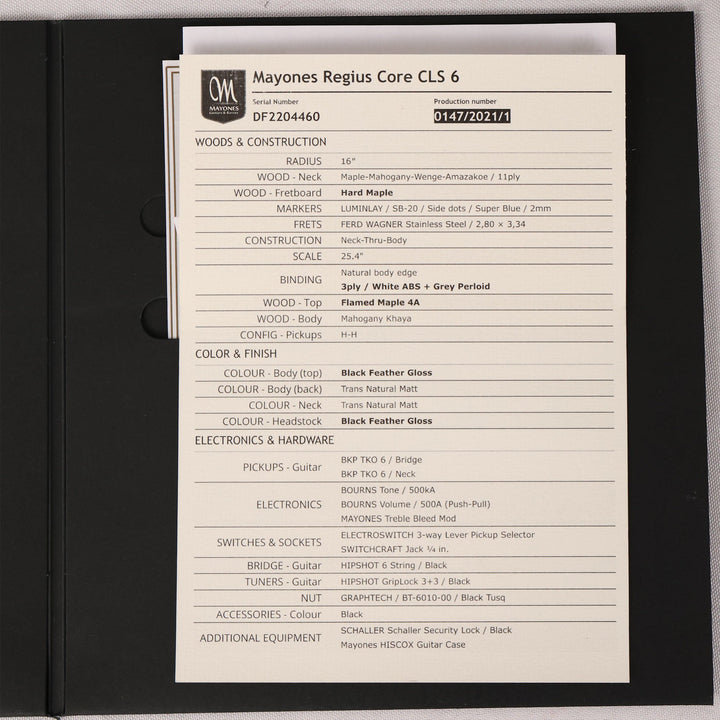 This is a lightly used Mayones Regius Core CLS 6-string model. Built in 2021 at the Mayones factory in Poland, the guitar features a 4A flame maple top finished in 'black feather gloss' over a mahogany body with 11-ply neck-thru construction comprised of maple/mahogany/wenge/amazakoe woods. For pickups: a set of Bare Knuckle TKO humbuckers with Bourns potentiometers. The guitar looks to have been barely played and includes the original case with COA and spec sheet!