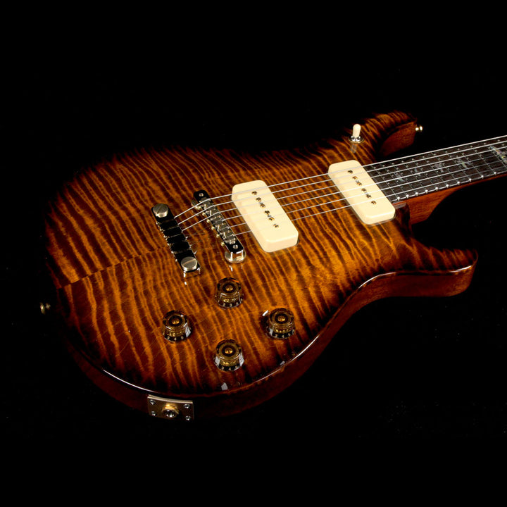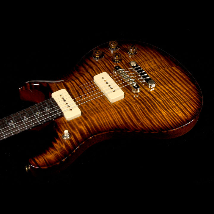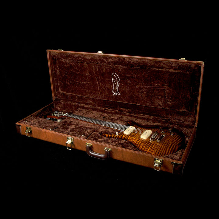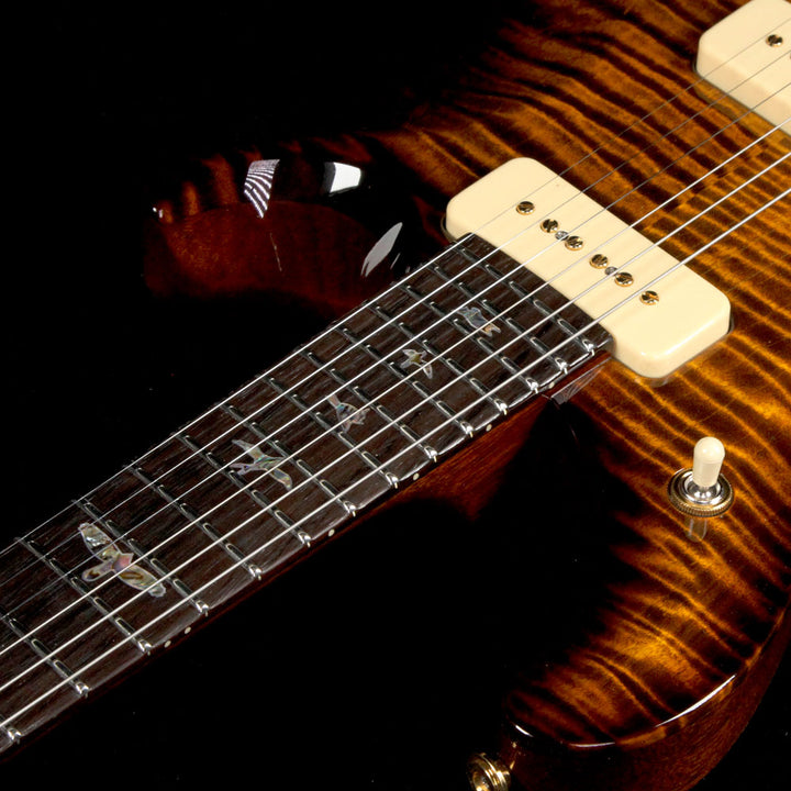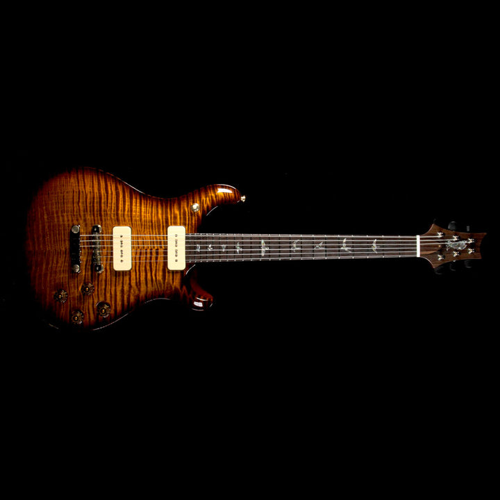 This beautiful work of art is also a functional instrument, believe it or not! This is a Paul Reed Smith Private Stock McCarty 594 with a Brazilian rosewood fretboard and a Black Gold Wrap Smoke Burst finish, spec’d out by The Music Zoo on a trip to the Maryland factory. This one has killer sounding P-90 pickups for a clear tone with lots of rich presence, and abalone Birds inlays.
