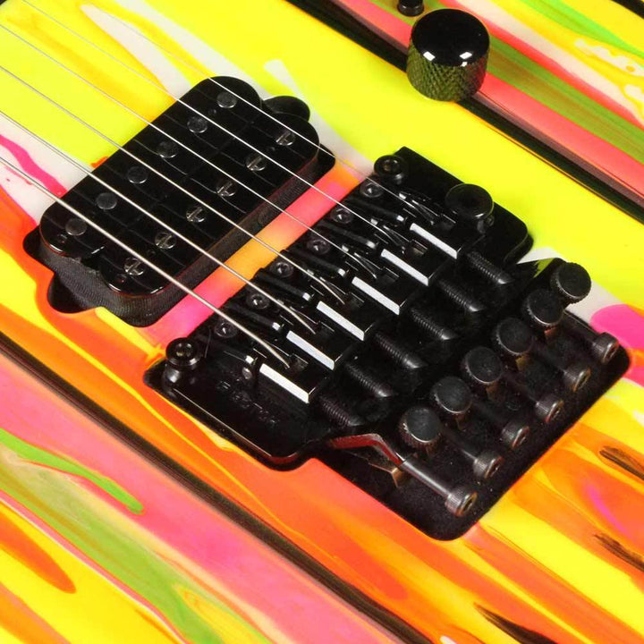 It doesn't get more eye-catching than this! A used Suhr Modern with a neon drip finish, ordered with some splashes of black thrown in there. This '80s-inspired guitar features a reverse style headstock, two Doug Aldrich humbuckers, and a Gotoh Floyd tremolo with a locking nut and Hipshot locking tuners - ensuring you that this beast will stay in tune no matter how many divebombs you throw at it. This guitar is in excellent condition with the original hardshell case included with it!