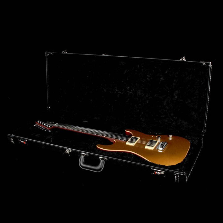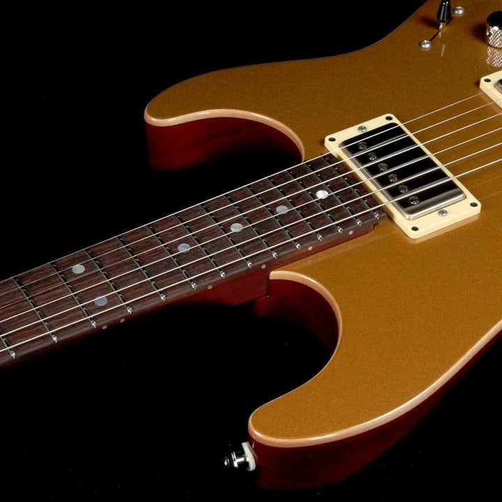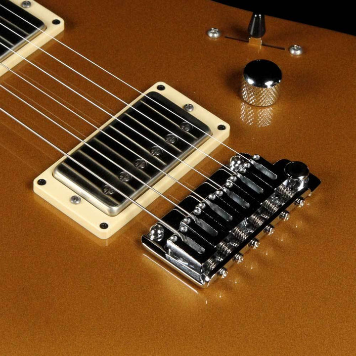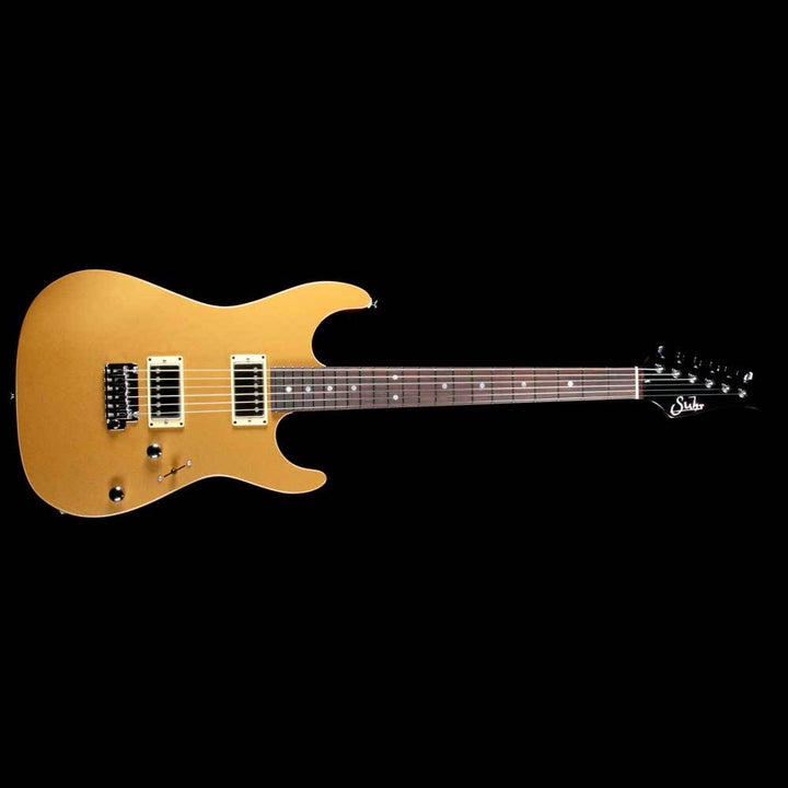 This Suhr Pete Thorn Signature is a sleek and versatile no nonsense tone machine! Finished in Vintage Gold, this guitar features a mahogany body with maple top, satin acrylic finished mahogany neck with rosewood fingerboard, a pair of Suhr Thornbuckers (duh) with pickup rings, Gotoh 510 trem, and locking Suhr tuners.