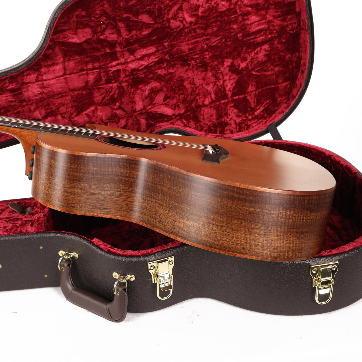 This Grand Auditorium is a used and repaired Taylor Custom Shop creation, built with Western Red Cedar for the top and Laurelwood back and sides, all wrapped up in koa binding. Unfortunately the repaired crack has re-opened and this guitar is being sold in as-is condition. The stand-out cosmetic of the guitar are the vibrant mother of pearl capstone fretboard inlays and rosette! As always, Taylor ES2 electronics are onboard for easy plugging in on stage or in the studio! The guitar had a crack on the back of the body repaired, and is now looking great, with the work holding and only a light line where it was glued to be seen, when reflected off of a light. The original Taylor hard case is included.