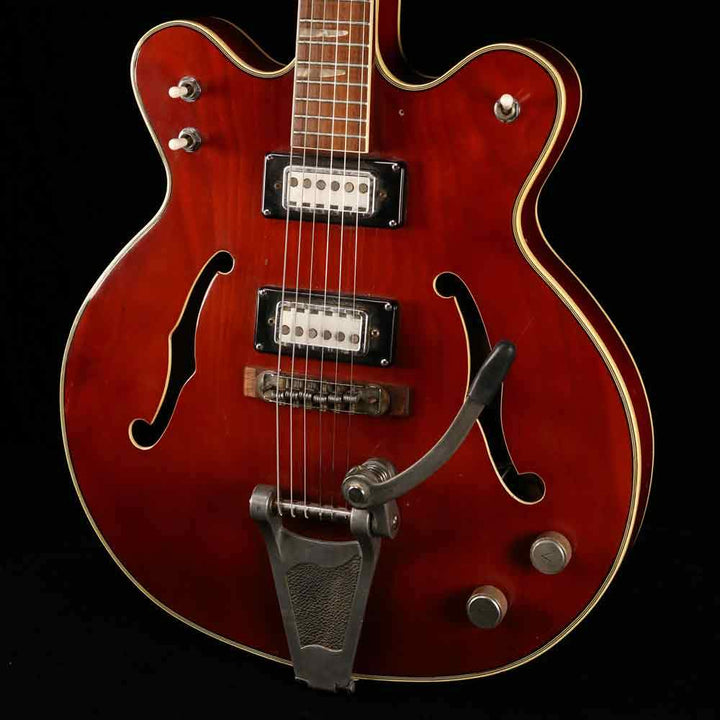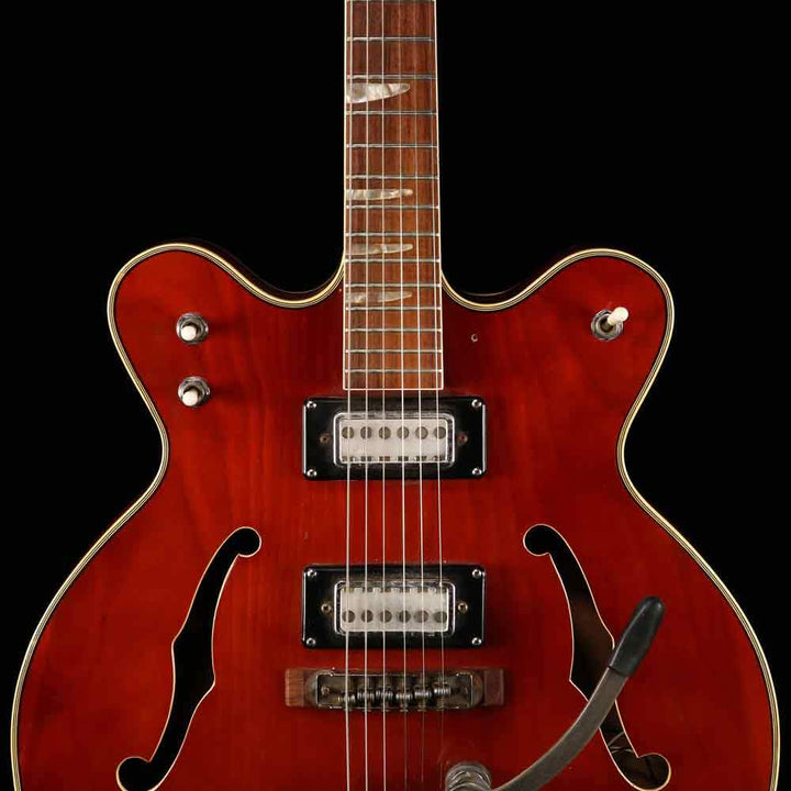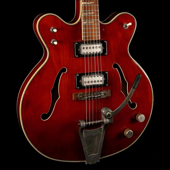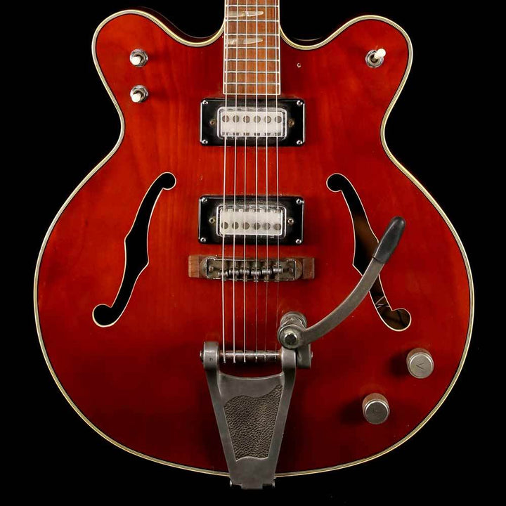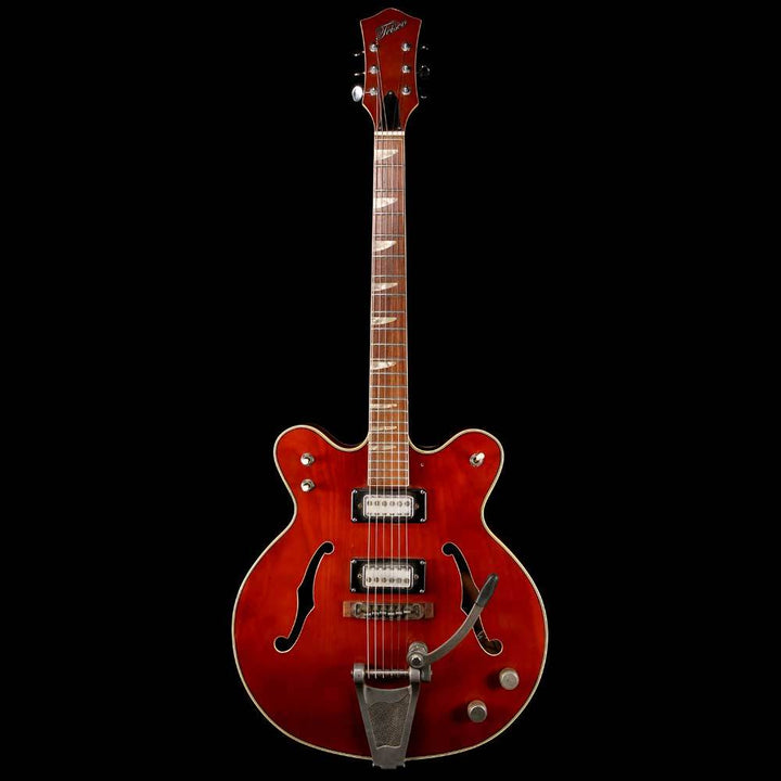 Packed with cool vibe, this is a used mid-1960s Teisco hollowbody dual-cutaway guitar, with a transparent cherry finish, two Teisco pickups with volume and tone controls, a bolt-on maple neck with original frets still in clean condition, and an easy-string-changing vibrato tailpiece. The guitar is in good playing condition. It does not have the pickguard included, and has a non-original Fender gigbag included.