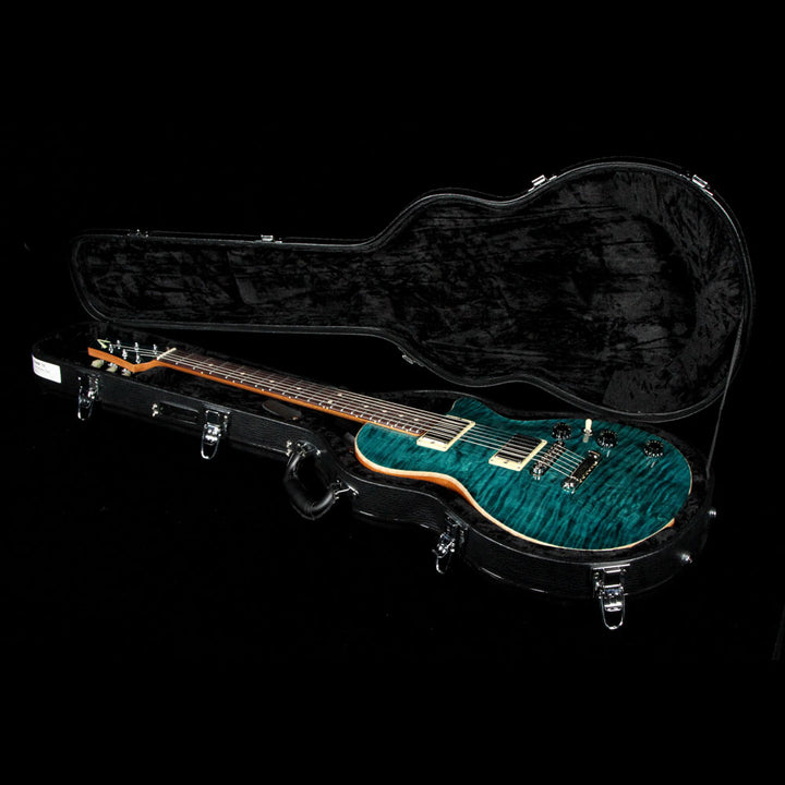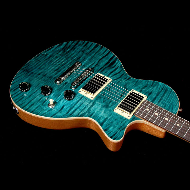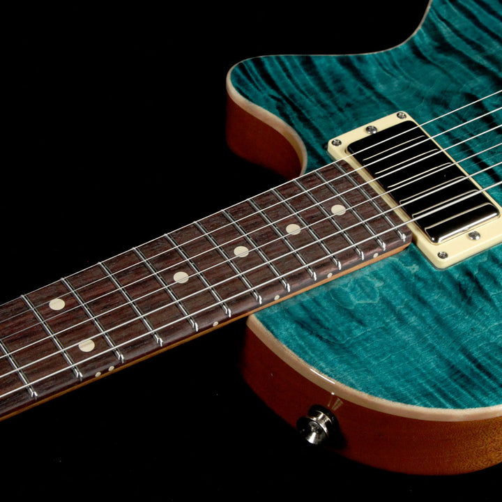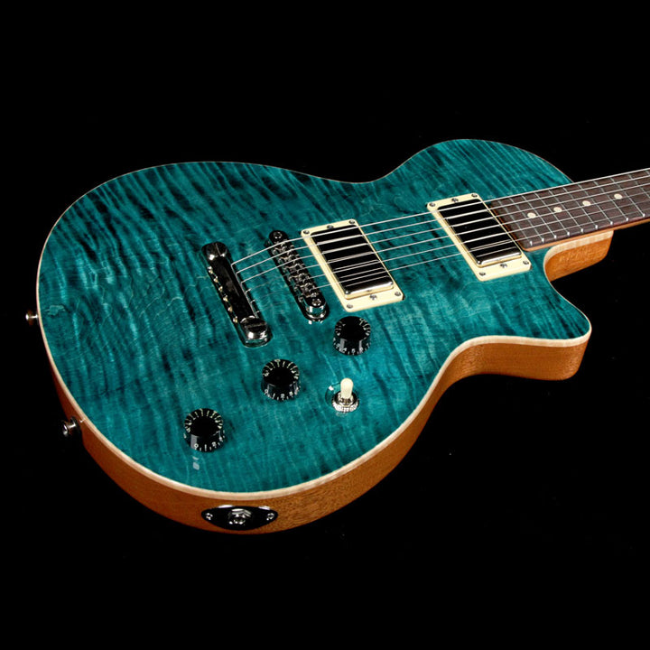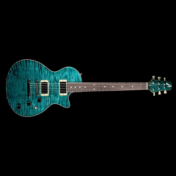 This is a Tom Anderson Bobcat guitar with a Cajun Teal finish over a figured maple top and mahogany body, which was on display at the 2018 NAMM show, and for good reason! The mahogany neck has the Anderson Happy Medium profile with a ziricote board and low-rise frets, along with Anderson pickups - a H1 and H2 in the neck and bridge respectively, paired with a tune-o-matic bridge with stopbar tailpiece to give you hot searing lead tones and a rock-solid intonation and feel. The tone knob is a push-pull to split the pickups for even more tonal variations.