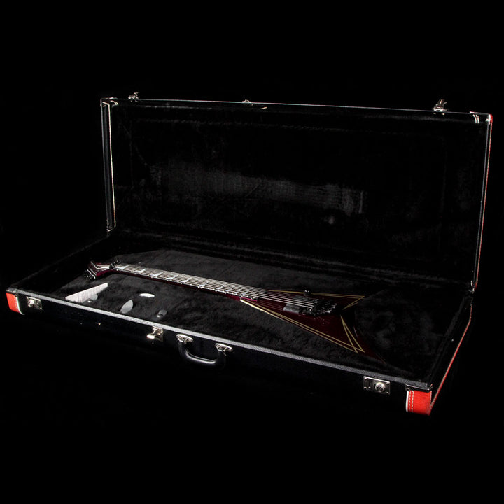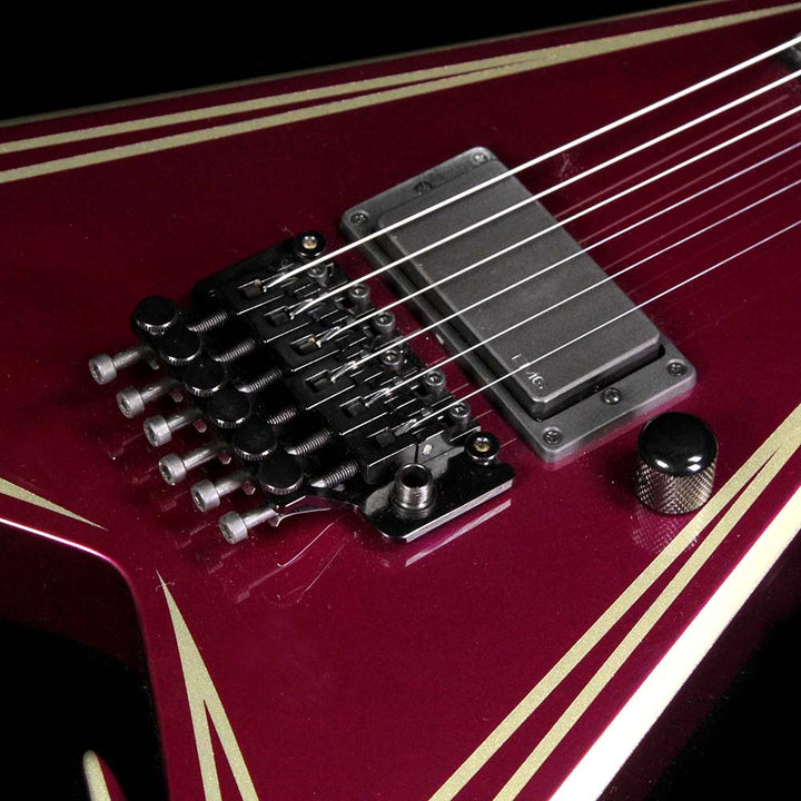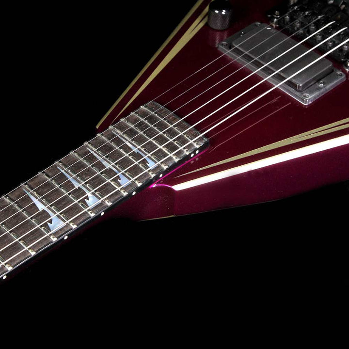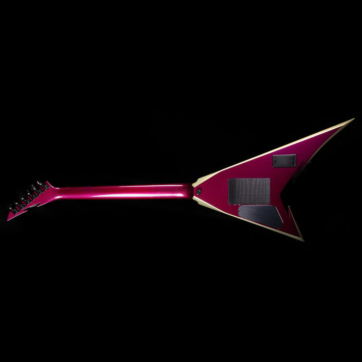 Talk about an eye-catcher! This is a pre-owned Custom Shop Jackson Rhoads Extreme built by Pablo Santana in 2008, with a purple finish complemented by gold bevels. The guitar has neck-through construction with an ebony fretboard, sharkfin inlays, and a single EMG 81 in the bridge position! This guitar is lightly used with no notable signs of wear. Includes original hardshell case! The guitar has a finish crack on the bass side next to the nut, nothing structural or anything which would affect the feel.