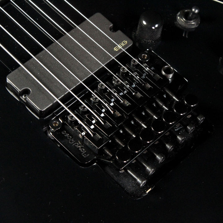 This used ESP E-II Horizon FR-7 is a fast-playing and great looking seven string guitar that is loaded with features both cosmetic and functional to make it an exceptional riff machine. With a black gloss finish on the alder body, stealthy black hardware, a Floyd Rose Original bridge, and EMG 707 humbuckers, there isn't much in the realm of heavy music that this axe can't do. The guitar has surface marks around the body, and a small ding underneath the Floyd Rose tremolo, nothing to affect tone or playability.