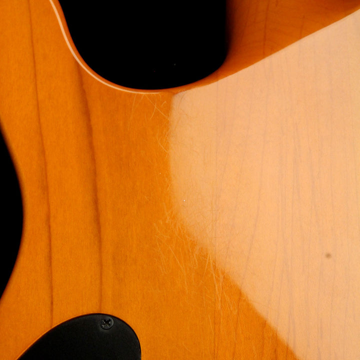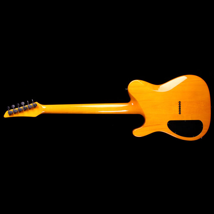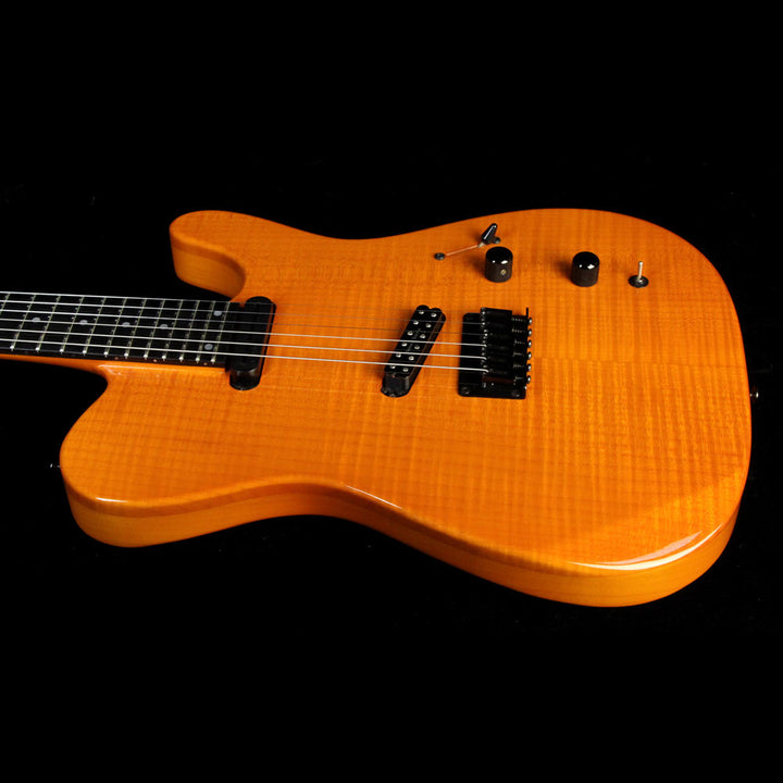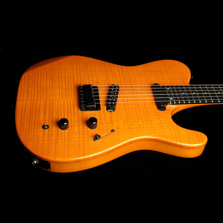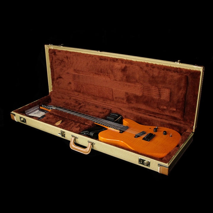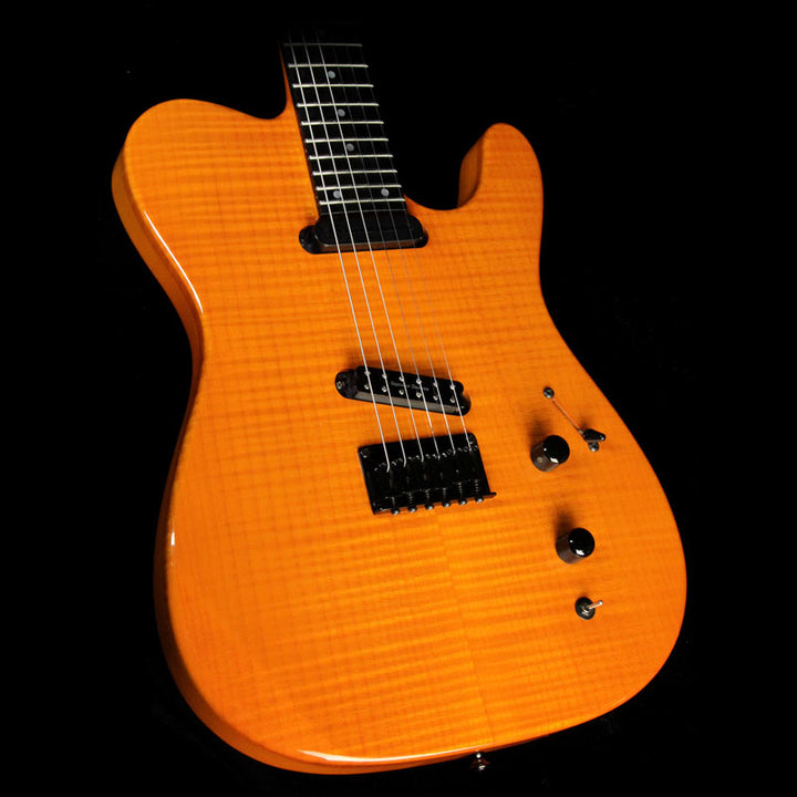 This is a killer looking pre-owned Carvin TL60 T-style neck-through guitar with a transparent orange finish over a flame maple top and ash body, with a fast playing maple neck, ebony fretboard, and two humbucking pickups – a blade in the neck with a Duncan JB in the bridge (which is aftermarket installed, and the original pickup not included). There is some light wear around the body with buckle rash on the back, nothing that breaks through the finish. A Carvin hardshell case is included.