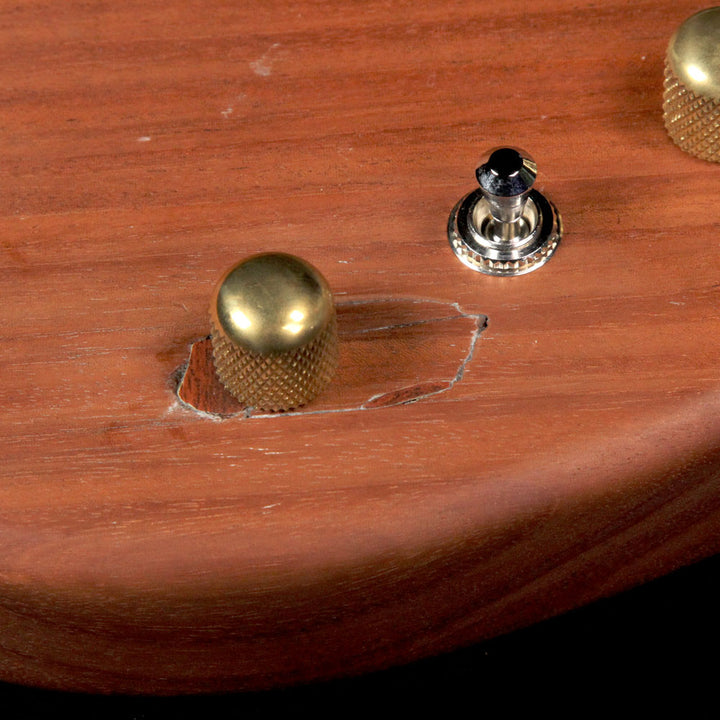This is a pre-owned cooked-wood San Dimas from the Charvel Custom Shop, built of a cooked mahogany body with a 1-piece roasted maple neck and 22 jumbo frets with a 12-16" compound radius for straight up shredding. The guitar has two Duncan pickups: a Quarter Pounder neck single-coil and a Custom 5 in the bridge with an old-school Charvel brass tremolo for those who want the solid feel of a vintage-trem guitar as opposed to a Floyd. The guitar had a mishap where the volume knob was pushed through the control cavity, however it has been repaired by re-gluing the wood that was damaged, is structurally stable, and the guitar still sounds great!