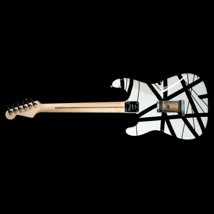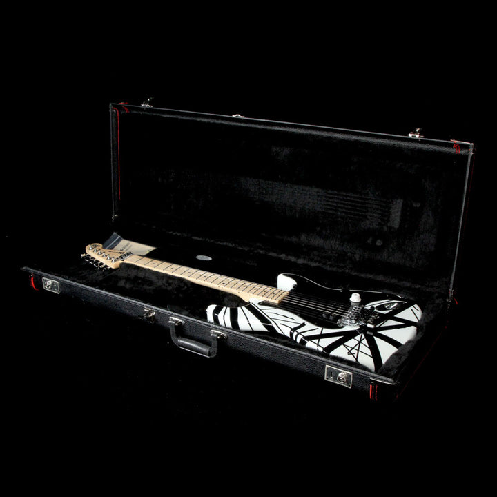 Here's a great pre-owned Charvel EVH Art Series guitar with the classic two-color stripes of black and white. These guitars feature a basswood body, bolt-on quartersawn Eastern hard rock maple neck with an oil finish, 22 jumbo frets, and a 25.5" scale length. They come with a custom wound single EVH humbucker, original Floyd Rose tremolo and the D-Tuna, which lets you drop your low E string a whole step at a moments notice. The necks on these instruments really stand out, the oil finish is incredibly smooth and tonally gives a very snappy and bright sound due to the hard rock maple. The guitar is in overall excellent condition with the trem arm and original case included!