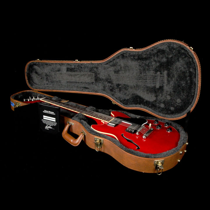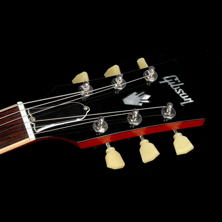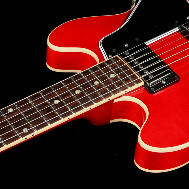 Finished in a classy Satin Cherry, this used Gibson Memphis ES-339 stands out on any stage! The 339 features a semi-hollow body design that takes the principles of the classic ES-335 and recasts them in a much smaller-sized guitar. The two '57 Classic humbuckers are capable of handling overdriven riffs and leads, and rolling down the volume allows you to play some rhythm while still retaining some grit to your tone. The guitar is in very good condition with light wear to it. There was at one point a pinup girl decal on the body, which has been removed but the outline of which still shows against the satin finish.