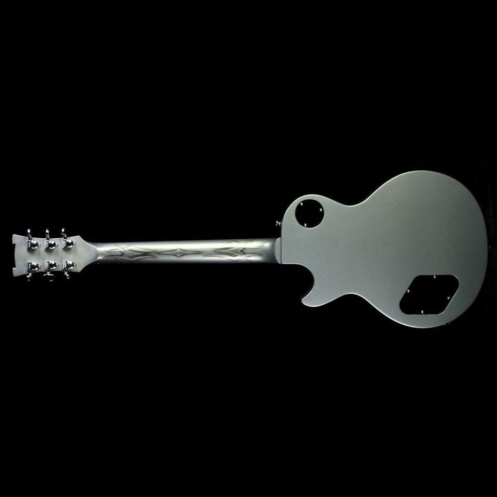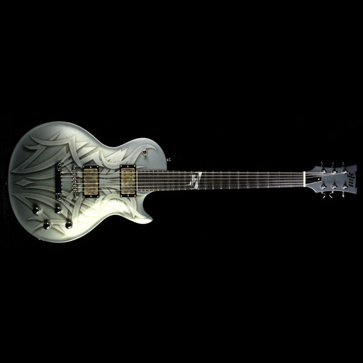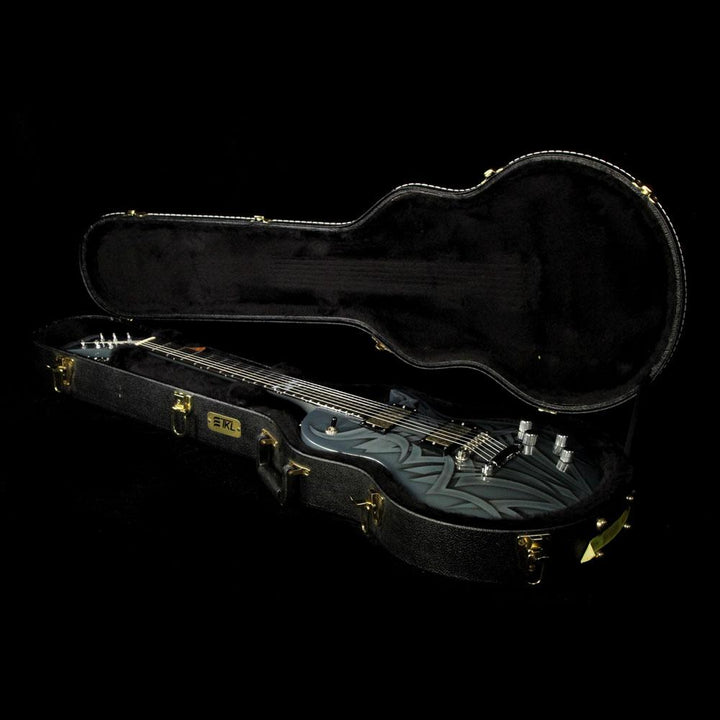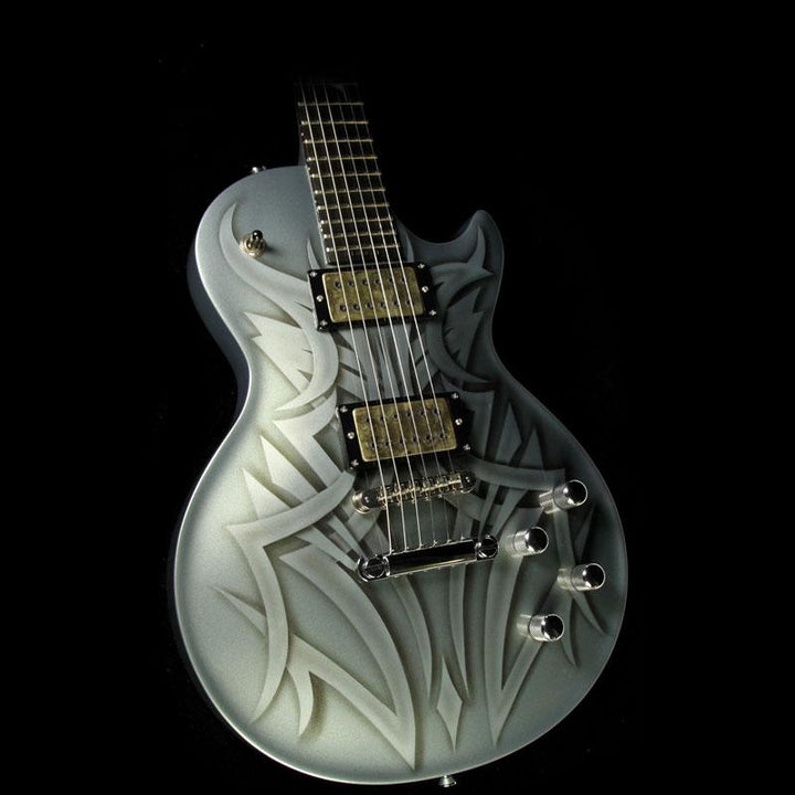 This is a used Jon Hill singlecut guitar, built by the Cleveland based builder with a dark silver/blue sparkle finish that’s been airbrushed over with a tribal design not only on the top, but the back of the neck as well. Loaded with two great sounding (however unlabeled) Bare Knuckle humbuckers. The guitar is in good condition, with some clouding in the finish around the fretboard edges, on both the bass and treble side. A TKL hardshell case is included with this guitar.