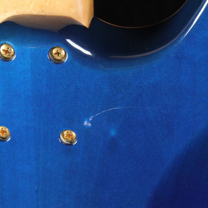 This beauty is a late '90s era Yamaha Pacifica USA-2 Custom. This USA (California) made Yamaha is a great example of the height of their Pacifica builds. It boasts a great looking flame top with Transparent Blue finish, a basswood body, nicely figured birdseye maple neck with rosewood fingerboard, a Wilkinson tremolo bridge paired with Sperzel locking tuners, and a set of Seymour Duncan pickups in in HSS configuration. The natural maple bound top is also a nice touch that you don't see often on these! This guitar does have some dings and scratches around the edges and back of the body, and some normal playwear, but overall it's nice and clean and plays and sounds great. It includes the original hardshell case and trem arm. An absolute steal for a guitar of this magnitude!